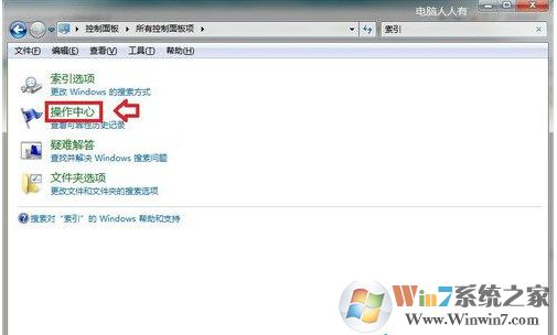 2、双击打开控制面板在右上角的搜索框中键入:索引→操作中心。