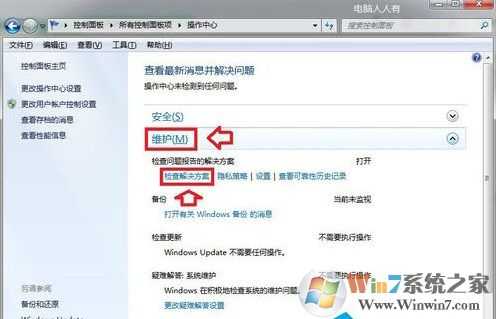 3、开始→控制面板→索引→操作中心→维护→检查解决方案。