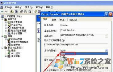 下一步中 右键属性,打开Print Spooler这个服务的属性,将其启动的类型改为自动;