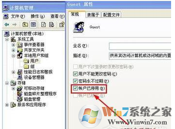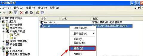 对Guest这个账户,右键属性选项,打开Guest账户的属性;