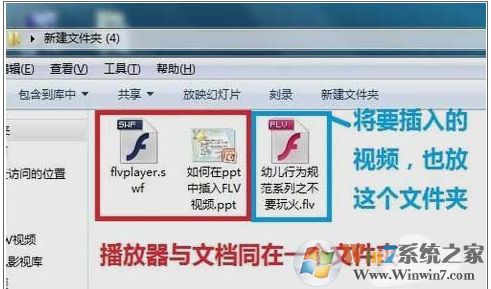 想要在ppt中播放FLV格式的视频,需要下载一个flvplayer.swf播放器,并且这个播放器必须放在PPT文档的同一文件夹中。如图: