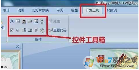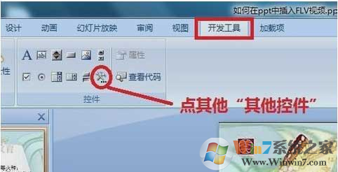 在PPT中打开“开发工具”,在下面的控件工具箱中点击“其他控件”。如图: