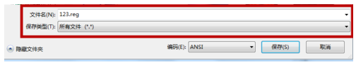 3、接下来保存文件。保存时注意,不要直接关闭保存,而是选择“另存为”。填写好文件名之后,把文件的后缀名字改为“.reg”,保存类型选择”所有文件“。