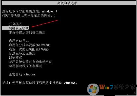 2、然后再开机按F8键(这时键盘肯定能用),然后到高级启动选项下选择【带网络的安全模式】;