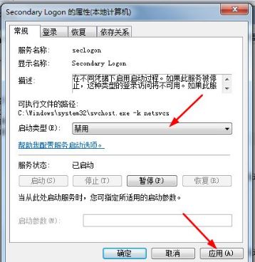 5、在打开的“Secondary Logon 的属性”对话窗口中,在启动类型选项中选择“禁用”选项,在点击“应用”按钮;