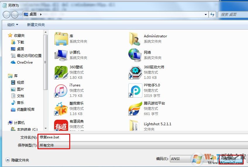 2,另存为文件名为 修复exe.bat 的文件,