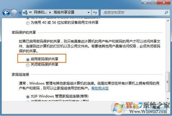 5、然后在出现的窗口中,在启用密码保护共享面前打钩,点击保存修改,下一次对方要访问自己电脑共享之前,就需要输入密码才可以访问了