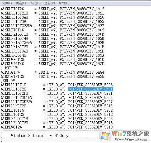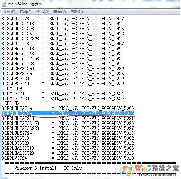6.以文本的形式打开igdlh64.inf文件。找到“%iKBLULTGT2% = iKBLD_w7, PCI\VEN_8086&DEV_5916”,这一段,把PCI\VEN_8086&DEV_5916替换成刚刚复制的硬件ID。