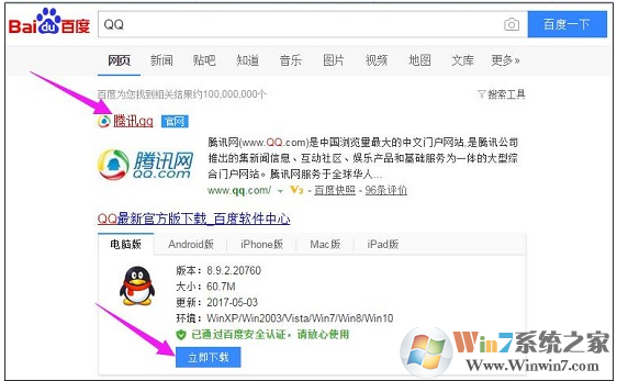 2、打开百度,在框中搜索QQ两字母。然后在搜索结果中会出现一个快捷的下载按钮,点击此按钮下载即可;、