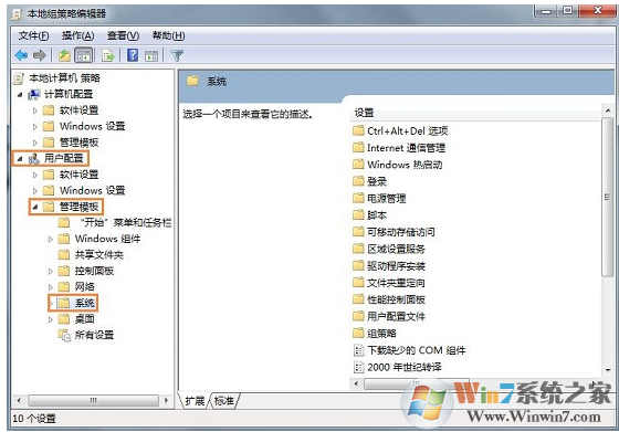 6、打开组策略编辑器后,点击用户配置,管理模板,在管理模板下有一个系统选项,用鼠标点击一下在右表中出现一列选项;