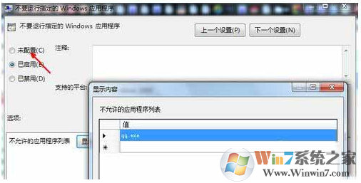 8、如果发现是已启用,然后点击下面的显示按钮,打开显示内容之后如果发现有如图所示的样子,即qq程序已经被系统禁用了,要点击确定之后,点击设置界面上的未配置选项。最后点击确定退出。