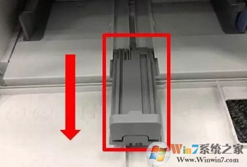 2、将纸张重新放入纸盒,往里推感到阻力时停止,再推入纸盘挡盖固定纸张。调整两侧导板位置夹住纸,防止歪斜(按右侧蓝色卡扣调整纸张导板位置),如图: