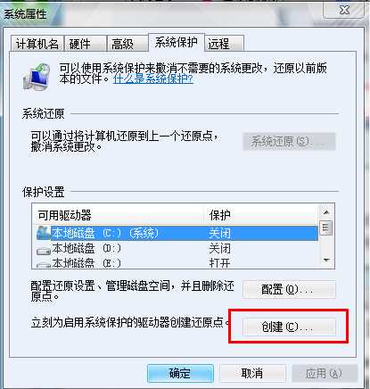 4:在“系统保护”框中点击创建,就可以等待还原点创建成功了,如图4和图5所示: