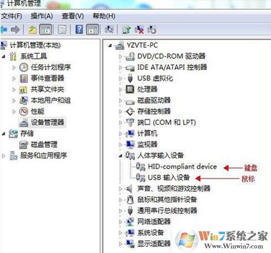 2、在打开的计算机管理窗口中,选择HID-compliant device右键选择更新驱动程序;