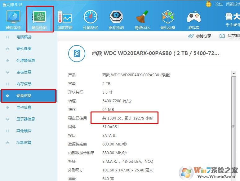 2、打开鲁大师查看一下该电脑使用了多久,主要看看硬盘使用了多久就能看出此电脑使用了多久
