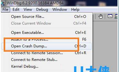 2、要分析Crash通过dump文件入手,需要安装windbg,在Windbg中,通过File→Open Crash Dump菜单可以打开dump文件进行分析,如下图所示: