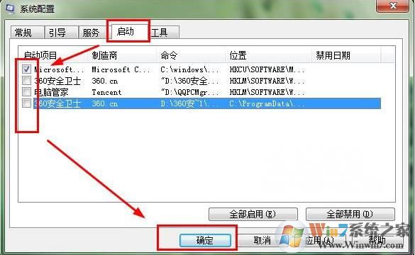 2、然后在运行中输入 Msconfig 回车,在启动中取消启动项,只保留输入法ctfmon。