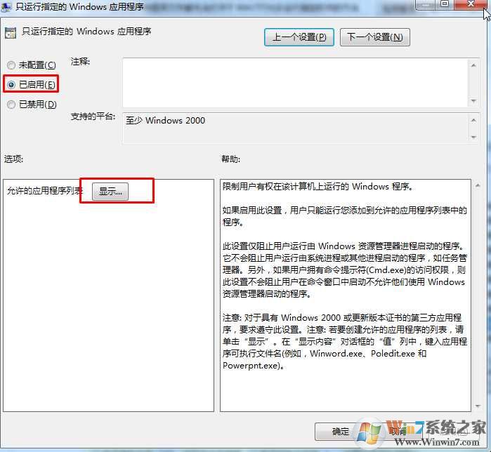 3、设置为已启用,然后点击允许应用程序列表 “显示”按钮;