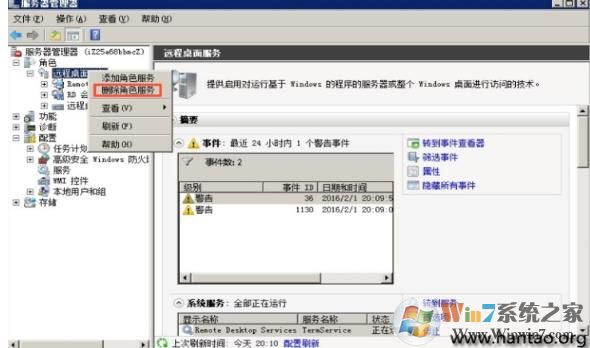 3.登陆成功后进入服务器管理器,在角色菜单中找到远程桌面管理服务右击删除角色服务