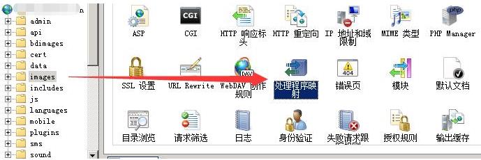 第一步:我们先打开IIS管理器,然后在左侧网站目录中找到需要禁止执行的目录并选中,然后双击右侧控制面板中的“处理程序映射”。
