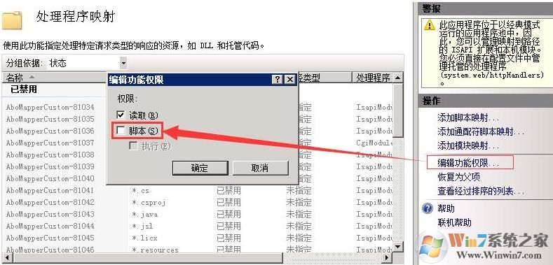 第二步:在右侧找到并单击“编辑功能权限”此项,在打开的编辑功能权限小窗口中,把“脚本”前面的勾去掉并确定。