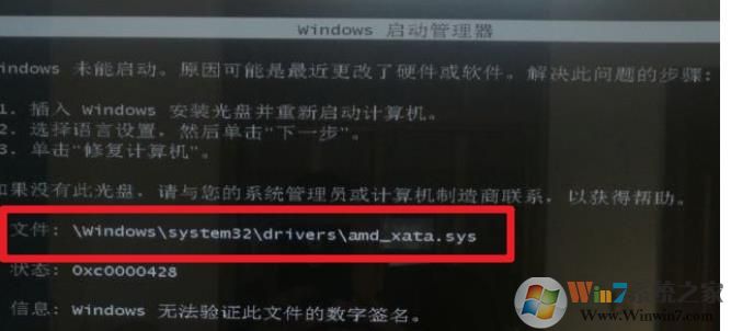 图:不少用户会遇到这个坑爹的【amd_xata.sys】无法验证此文件数字签名问题