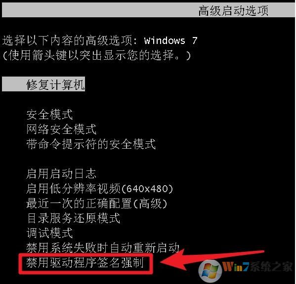 第一步是,重启电脑,狂按F8(如果是笔记本可能要按Fn+F8才行),见到以下界面后,选择【禁用驱动程序签名强制】。