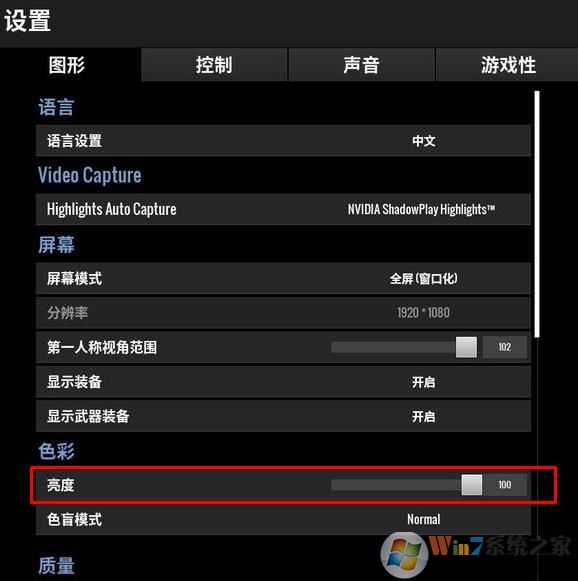 在吃鸡游戏的设置——图形中,我们可以看到色彩,我们把亮度提高即可。,最大100