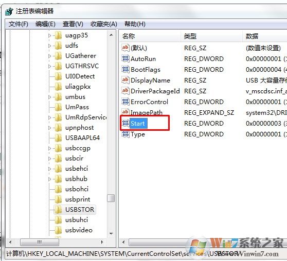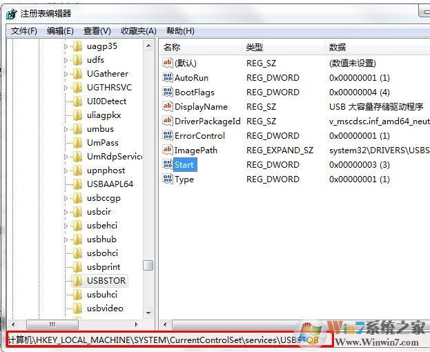 3、在注册表中找到[HKEY_LOCAL_MACHINE\SYSTEM\CurrentCntrolSet\Services\USBSTOR]
