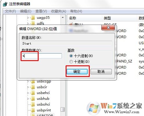 5、在弹出的编辑对话框中将其数值数据修改为十六位进制数值“4”。点“确定”按钮并关闭注册表编辑器