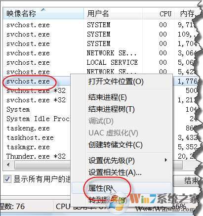 2、右击某一Svchost.exe程序在弹出的菜单中选择“属性”