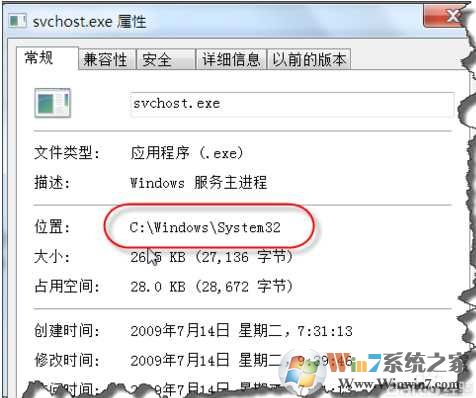 3、在“属性”窗口,你可以看到其位置:C:\Windows\System32如果不在这个文件夹里,很可能电脑中毒了。