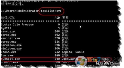 6、大家还可以在“运行”对话框中(快捷键win+R)中输入CMD。在其窗口中输入“tasklist/svc”指令,回车后,你会看到如图列表,如果在svchost.exe进行显示“暂缺”,那中毒的可能性也很大。