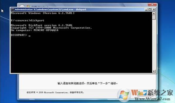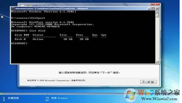 再CMD命令行窗口中直接输入“diskpart”命令,之后按下“回车”键,就会自动进入Diskpart模式: