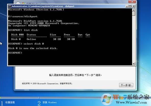输入“select disk 0”命令并按下“回车”键来选择电脑中的硬盘