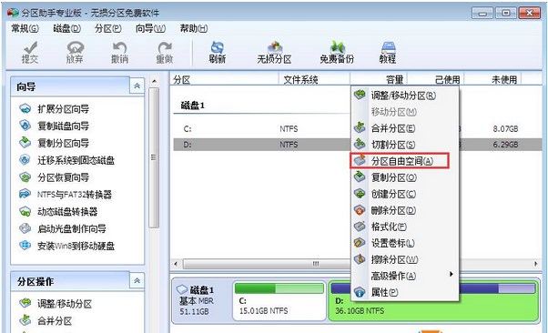 2、打开分区助手,到主界面后,右键点击你想划空空间给C盘的分区,小编以D盘为例,然后点击“分区自由空间”;