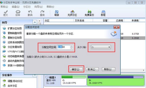 3、设定好你要分配给C盘的空间大小,并指定给C盘,然后点击确定;
