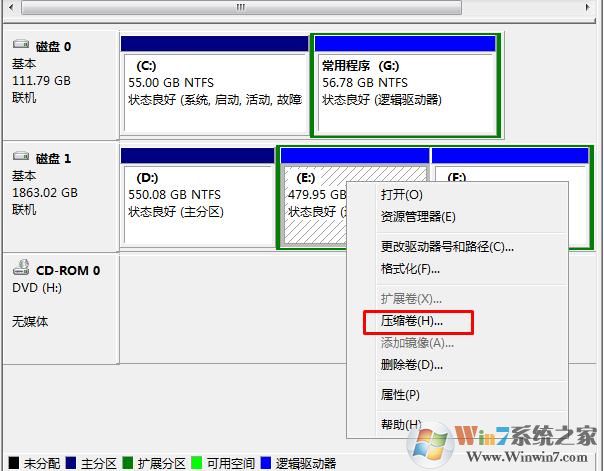 2、接下来,我们一起来看,小编是D盘空间不够了,而E盘还有很多,那么我们右键点击E盘,选择“压缩卷”;(注意,小编是双硬盘,只能在同一个硬盘内进行划分 D和E是同一个硬盘的磁盘)