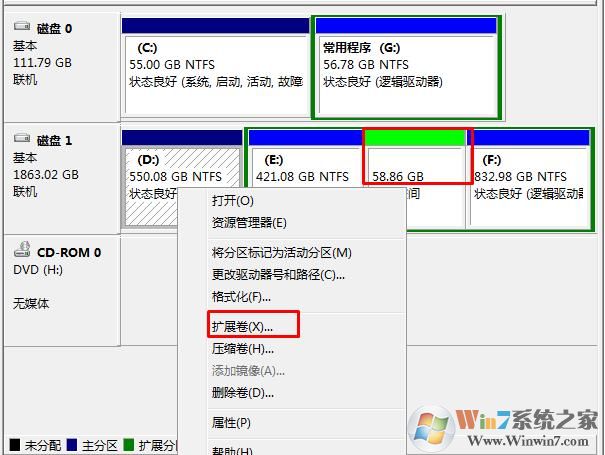 4、这时我们看到58G左右的未分配可用空间,然后点击D盘,右键选择“扩展卷”;