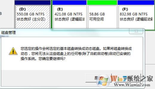 由于小编的D盘是机械硬盘的第一个分区,所以在扩展磁盘时会出现基本磁盘转为动态磁盘的提示,并且如果C 盘有系统的话,建议大家不要合并,没有的话就全所谓了。