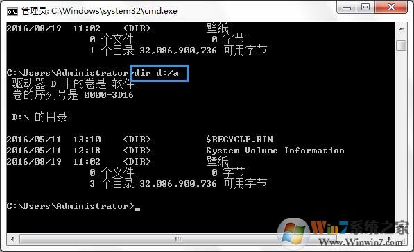 3、也可以输入“dir d:/a”查看d盘所有文件,包括隐藏与未隐藏的文件,如图所示: