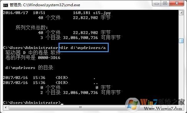 6、查看某个文件夹的所有文件的话,则在磁盘于命令参数中间加上“\文件名”,例如查看d盘中的mydrivers文件夹,在命令提示符输入“dir d:\mydrivers/a”并按回车执行,如图所示: