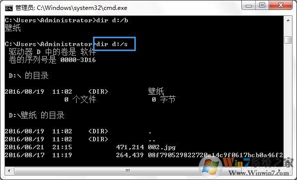 5、输入“dir d:/s”查看d盘未隐藏的详细文件,如图所示: