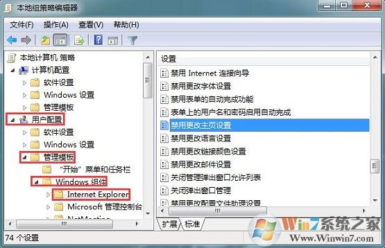 2、依次展开用户配置-管理模板-windows组件-internet explorer,找到并打开禁用更改主页设置,如下图所示:
