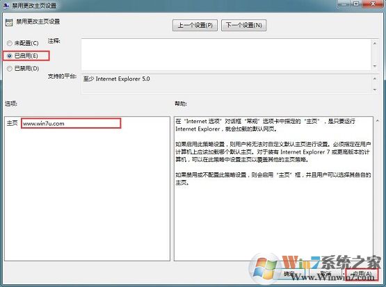 3、接着在打开的界面中,点击已启用,然后在选项主页那边输入你要锁定的主页网站即可,如下图所示: