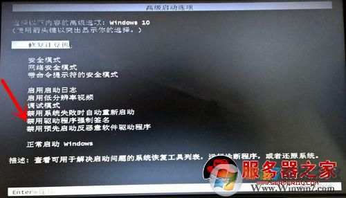 2、选中“禁用驱动程序强制签名”或“最近一次正确配置”选项,点击回车进入系统。