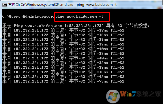 输入ping 你的游戏网址或者百度 -t,如下图,你会看见会出现数字信息,如果是一直稳定波动不大的,那么就说明网络没有问题,如果出现波动很大你就需要联系网络运营商让他们上门维修了