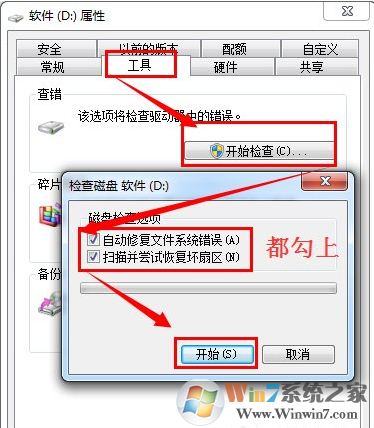 1、右键点击“移动硬盘/U盘”→“属性”,在弹出的窗口中选择“工具”→“开始检查”→将“自动修复文件系统错误”和“扫描并尝试恢复坏扇区”。