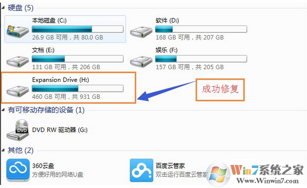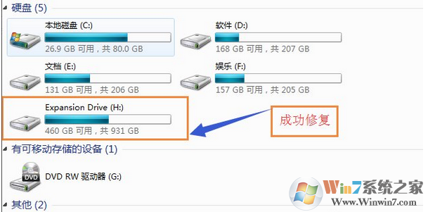3、修复完成之后“我的电脑”也正常显示磁盘空间,双击正常启动。