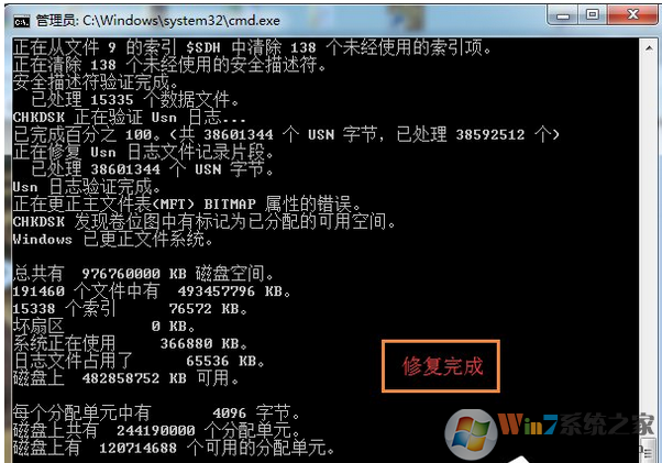 2、输入“chkdsk H:/f”这里修复的H盘,修复D盘就是“chkdsk D:/f”,系统开始修复,过一会儿就修复完成了。